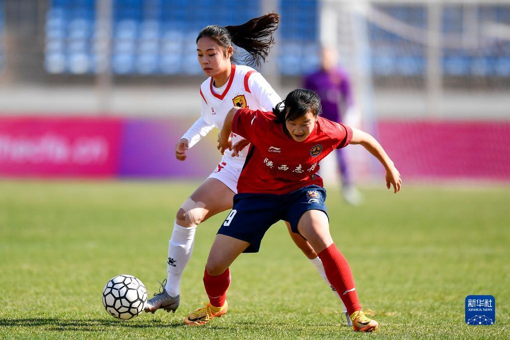 4月22日,长春大众卓越队球员李一凡(左)在比赛中与陕西志丹队球员师晓敏拼抢。新华社记者 许畅 摄