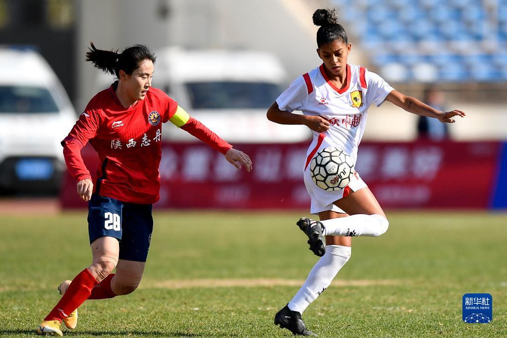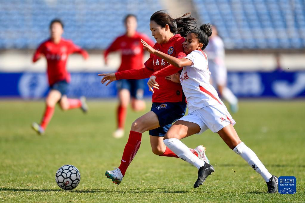 4月22日,长春大众卓越队球员安娜·比阿特丽斯(右)在比赛中与对手拼抢。新华社记者 许畅 摄