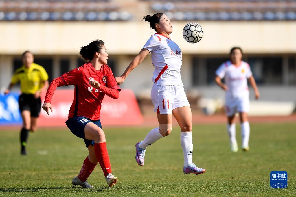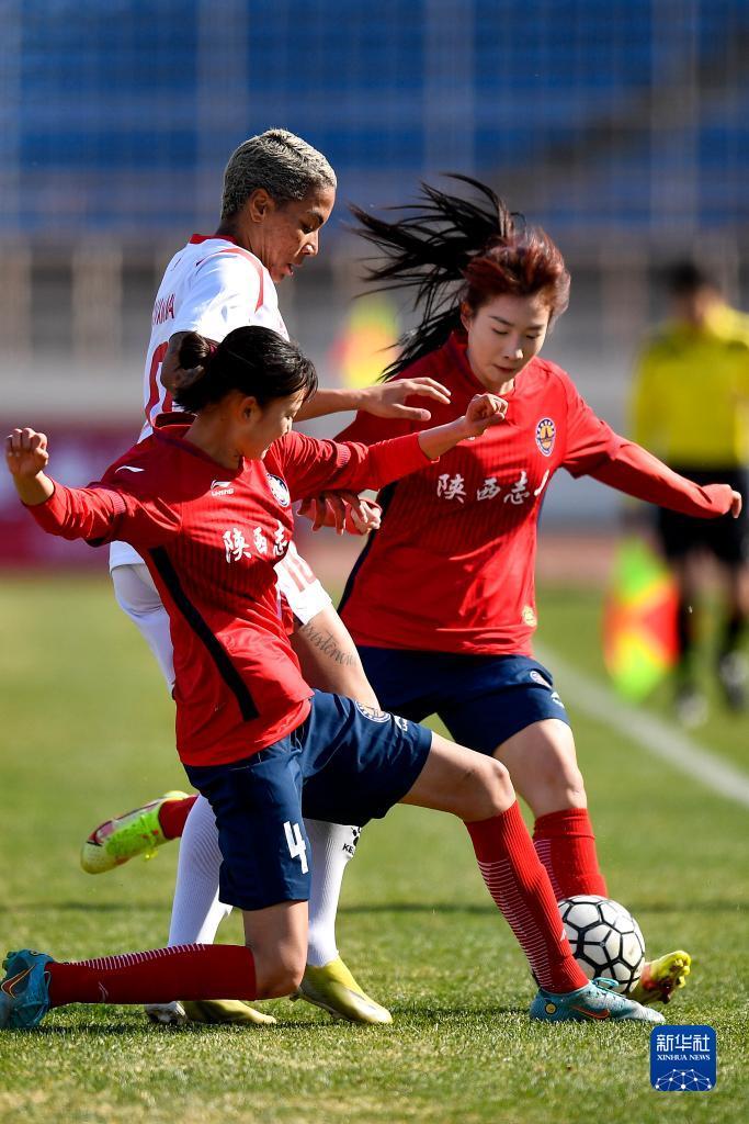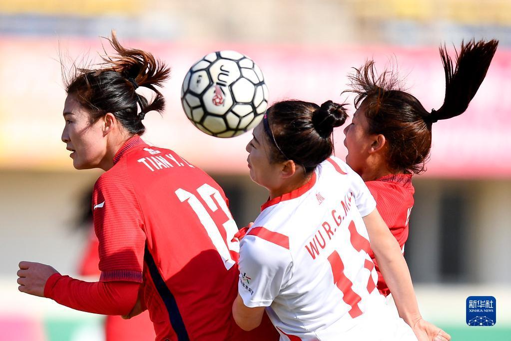 4月22日,长春大众卓越队球员司雨(前排左二)在比赛中与陕西志丹队球员杨晓霞(中)争顶头球。新华社记者 许畅 摄
