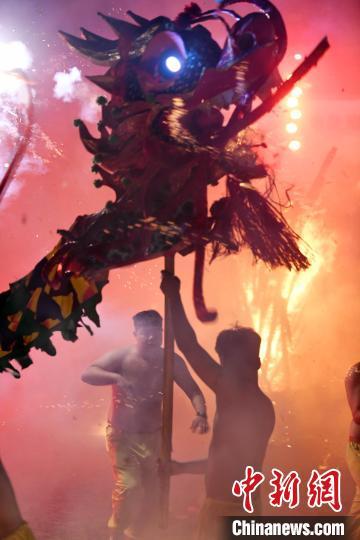 中新网南宁4月23日电(蒋雪林 伦俊芝)十多名舞龙男子光着膀子,疯狂地舞动着炮龙,现场观众点燃祝福的鞭炮甩向炮龙身上,现场龙狂舞、炮齐鸣、人狂欢。这一场景出现在广西南宁市宾阳县22日晚举行的邕台民族民俗文化交流活动的现场。