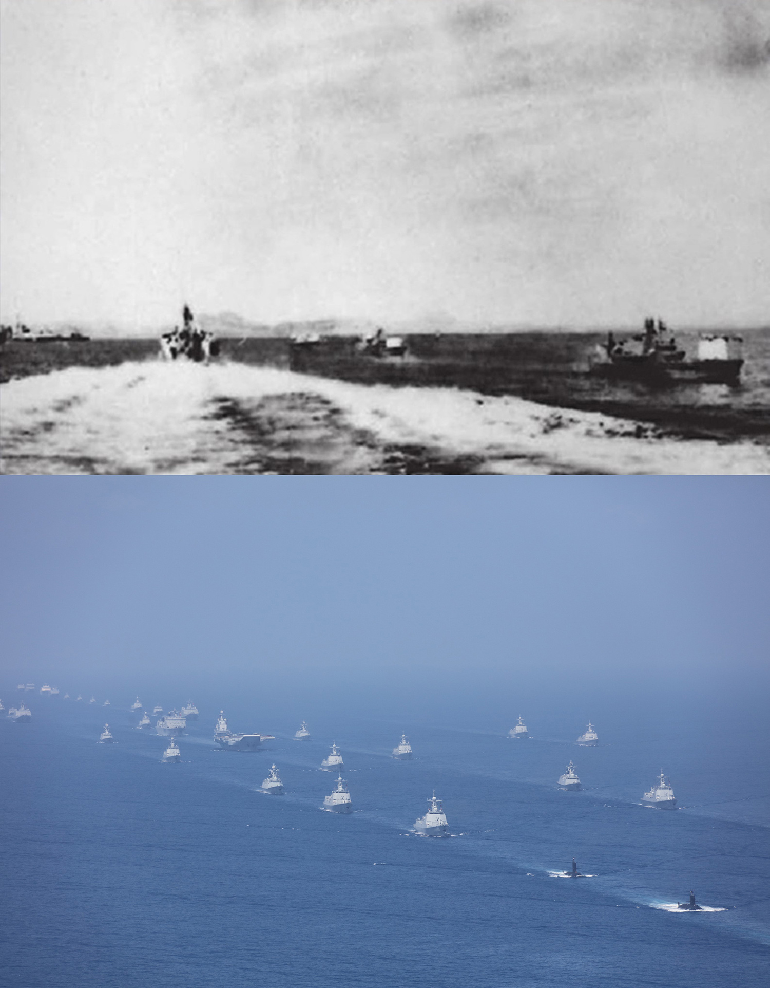1957年8月4日,第一次海上大阅兵——海上编队接受检阅。人民海军总计舰艇35艘、飞机44架接受检阅。