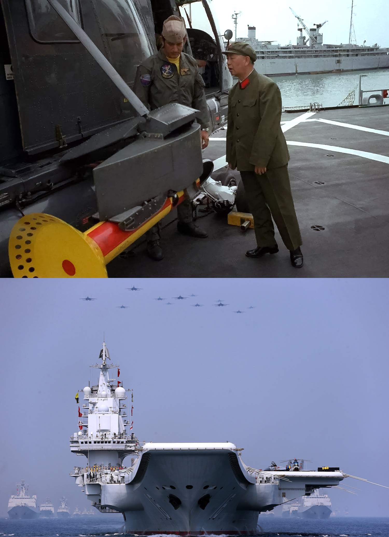 2012年9月25日,我国第一艘航母辽宁舰,正式入列人民海军。同年,国产歼-15舰载机成功起降航母。图为2018年南海大阅兵,制空作战梯队飞越航母编队上空。