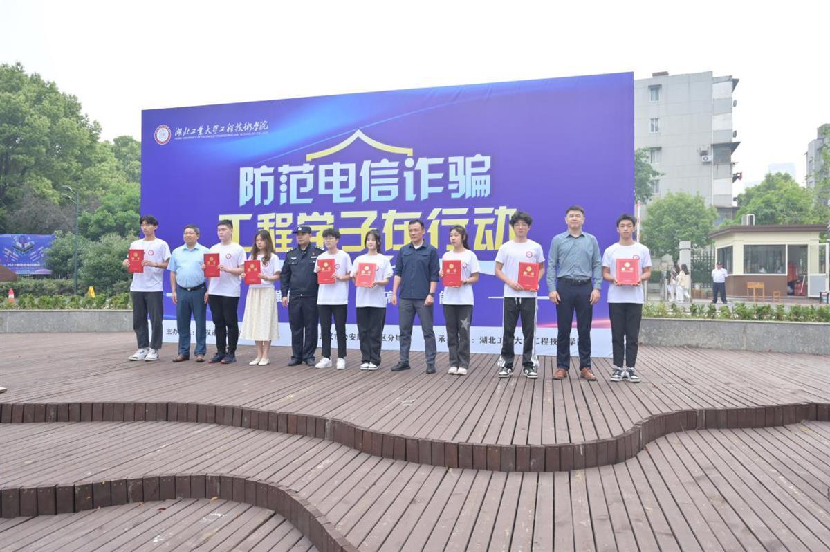 “摸清诈骗的特点、逃离骗子的视线、有你有我一起共同筑牢反诈的防线……”早上九点半,一首由师生重新填词改编的反诈开场曲《奔跑的青春》,配上精心编排的反诈“啦啦操”燃爆现场。学院党委副书记门奎英在开幕仪式上致辞,表示该活动通过各项有趣的“沉浸式”反诈体验,让同学们在寓教于乐中学到反诈知识,共同成长。学院副院长黄华为洪山区公安分局反诈中心负责人张珏涵警官颁发湖北工业大学工程技术学院反诈教育校外导师聘书。10名在“全民反诈”中表现突出的同学被聘为“防诈骗宣传大使”以鼓励、带动更多同学参与到防诈宣传中来。