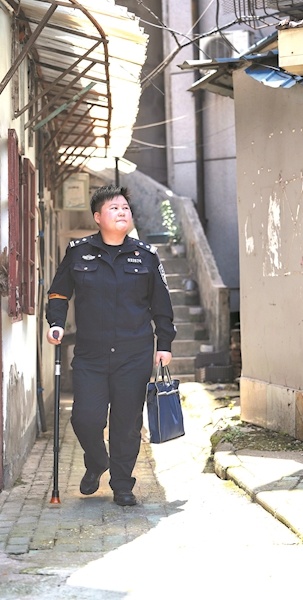 早晨7时50分,武汉市武昌区彭刘杨路,一辆微型电动汽车停在黄鹤楼街派出所门前,女片警郭晓丹拄着拐杖下了车,走进派出所。