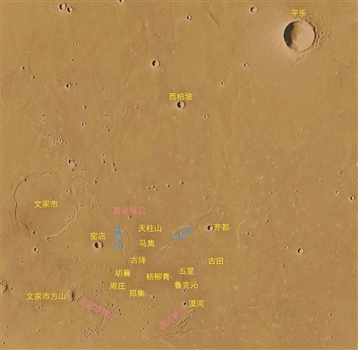 国家航天局还披露,科学研究团队通过火星高分影像,识别了着陆点附近大量的地理实体,国际天文联合会根据相关规则,将其中的22个地理实体,以中国人口数小于10万的历史文化名村名镇加以命名。据悉,这些用来命名火星地理实体的中国名村名镇包括西柏坡、齐都、漠河、鲁克沁等。