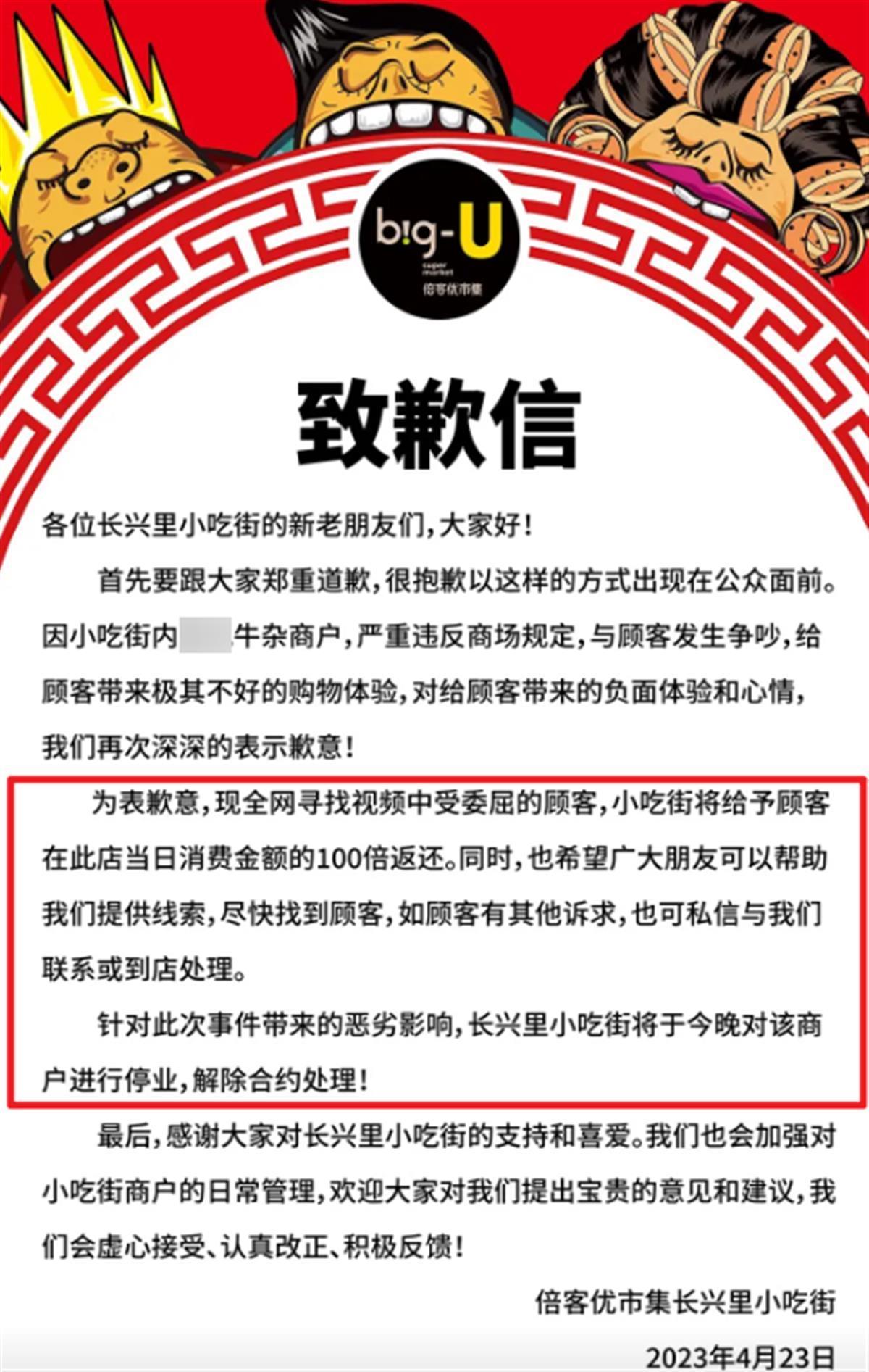 极目新闻记者注意到,4月23日,倍客优市集长兴里小吃街也在其社交账号上发布了一封致歉信,对小吃街内牛杂商户,严重违反商场规定,与顾客发生争吵,给顾客带来极其不好的购物体验,给顾客带来的负面体验和心情,表示深深的歉意。致歉信中提到,全网寻找视频中受委屈的顾客,小吃街将给予顾客在此店当日消费金额的100倍返还。同时,也希望广大朋友可以帮助提供线索,尽快找到该顾客,如顾客有其他诉求,也可私信与小吃街联系或到店处理。