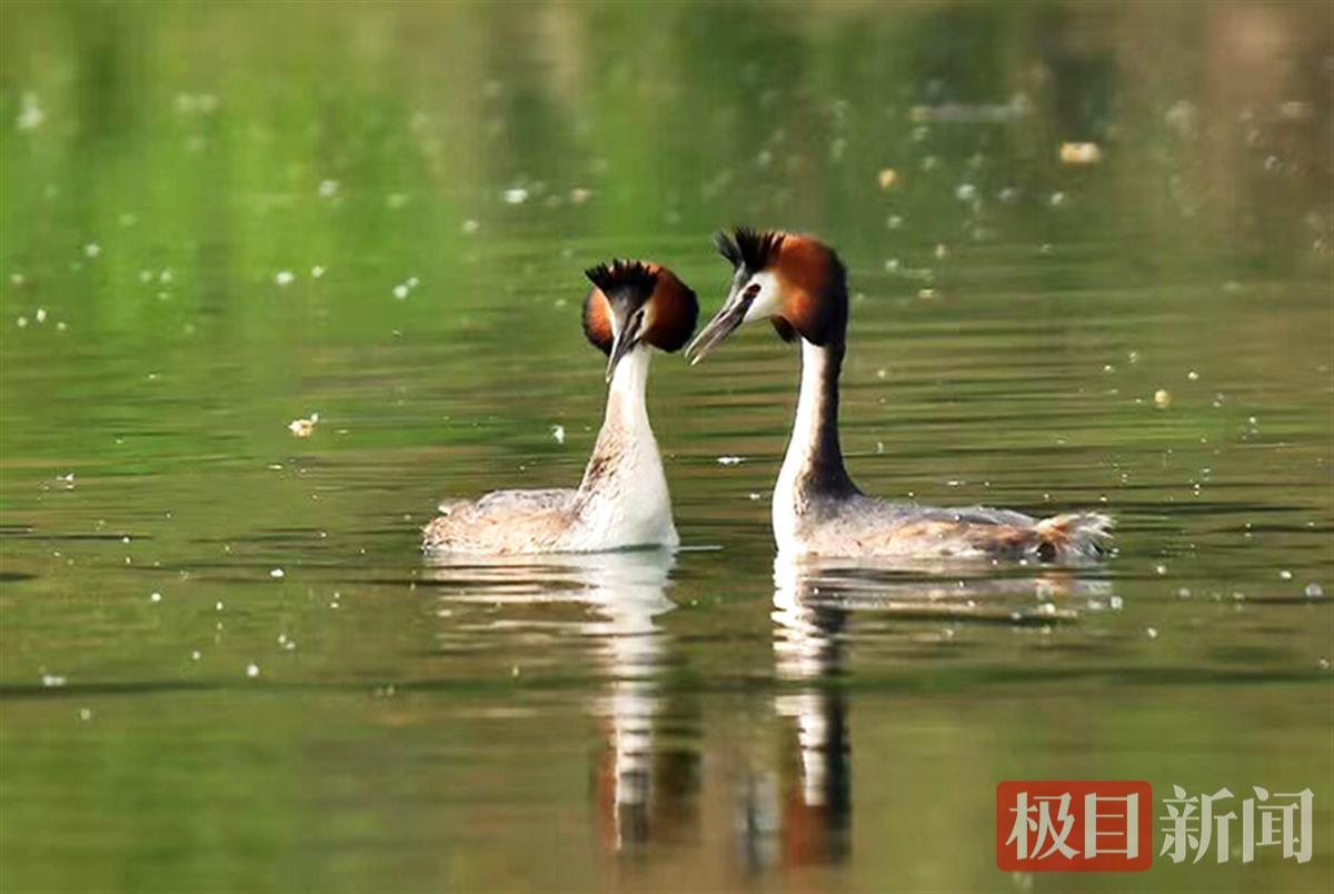 四月中旬以来,丹江口坝下汉江水域沧浪洲湿地,斑嘴鸭、白骨顶鸡、红嘴鸥、黑水鸡、白鹭等多种水禽数不胜数。它们时而逆水游弋,时而水下觅食;时而踏浪起飞,时而翱翔碧波。颈部修长,“发型”别致的凤头鸊鷉格外引人注目。每当它们潜水浮出水面,就两两靠近,双双碰喙,引颈欢歌,旁若无人“秀恩爱”。仲春时节,万千水禽聚集在碧波荡漾的丹江口沧浪洲湿地寻偶示爱,构成了一幅生机勃勃的生态画卷。