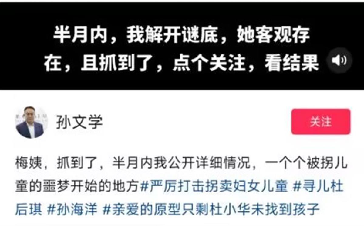4月25日,孙卓被拐案代理律师孙文学在社交平台上发布信息称,“梅姨,抓到了,半个月内我公开详细情况,一个个被拐儿童的噩梦开始的地方。”