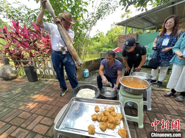 在陵水文罗镇坡村品尝当地产的莲雾,参访团成员评价,“这里的‘黑金刚’莲雾不输台湾屏东产的个头,而且清甜可口,更有‘莲雾味’”。走过万宁文通村的农家小院,看到黎族阿哥在打糍粑,巴湃·拉拉格狮接过木槌,熟练地捶打石槽中的糯米饭。参访团的陈诚三和着捶打节奏唱起带有其民族特色的吆喝歌,并说道,“我们(台湾)那里也这样,会使用同样的生产工具,吃同样的食物”。