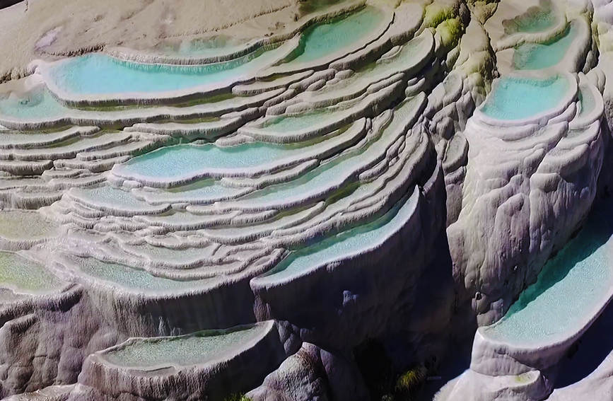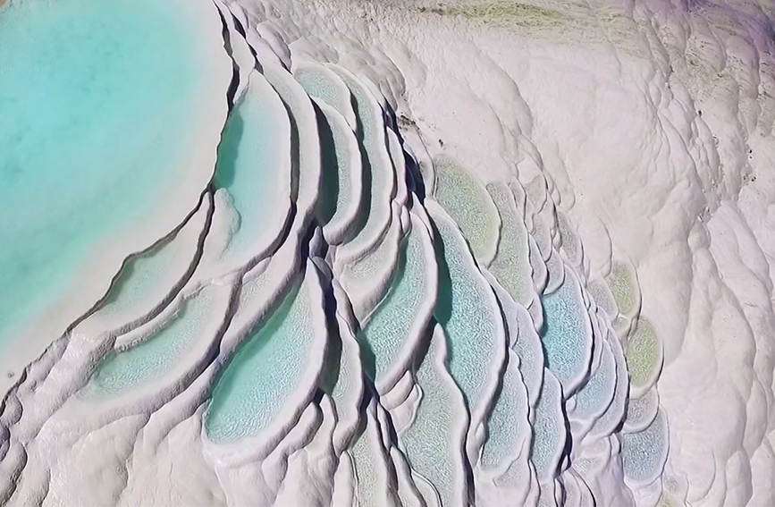 白水台层层叠叠的钙化池如白色梯田一样,盛满了澄澈的蓝色湖水。(香格里拉融媒体中心供图)