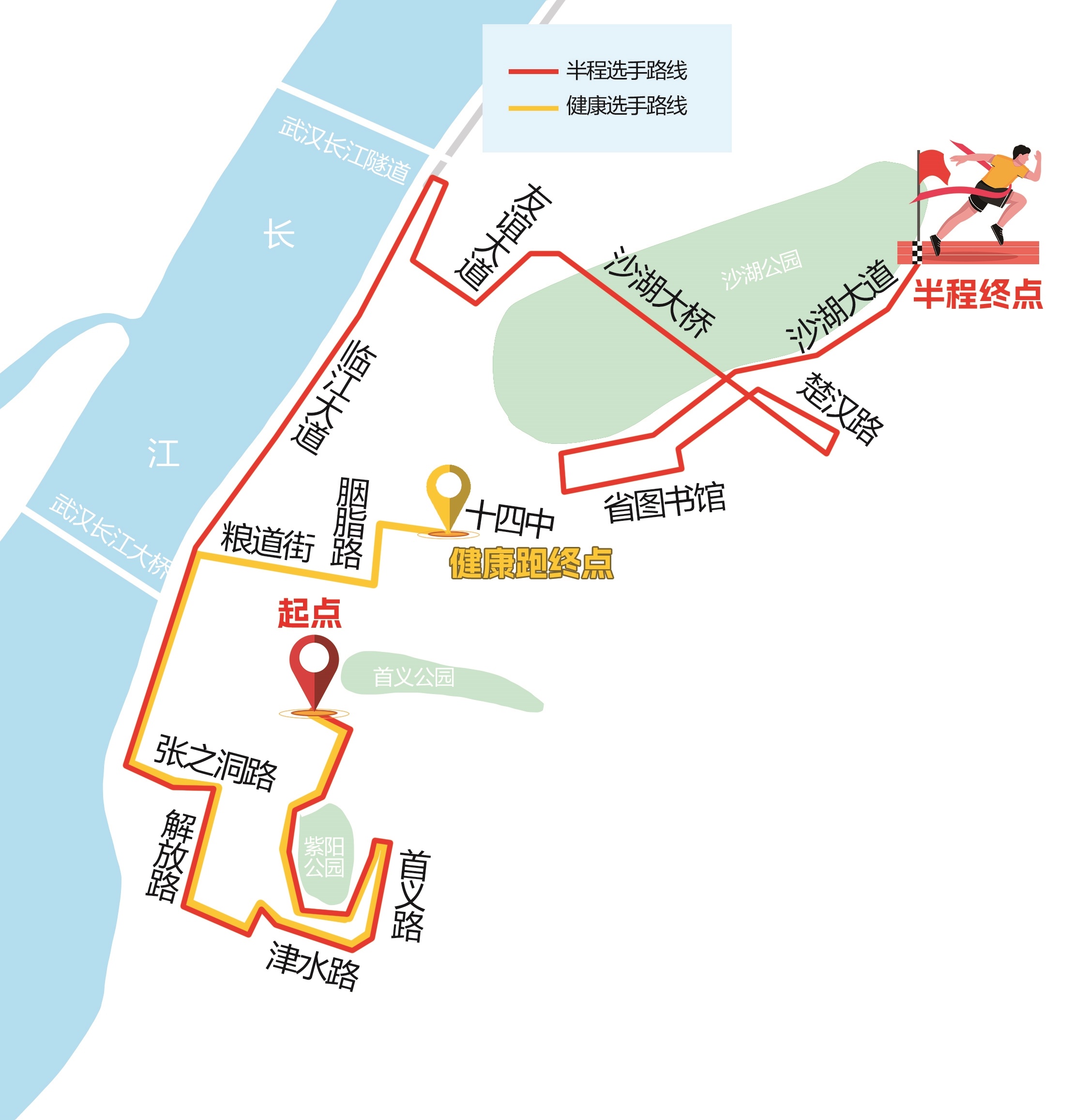 比赛当天,跑友们将从首义广场出发,穿过具有“生态之眼”美誉之称的紫阳公园,迈过武昌古城九大城门中的起义门,途经粮道街、昙华林、沙湖大桥、湖北省图书馆等武汉地标性建筑,抬头可眺望千年前李白诗中的黄鹤楼,还将跑过华中金融城中北路金融集聚区。踏入这条赛道,武昌古城1800年的前世今生的美,将毫无保留地展现在你眼前。健康跑的终点位于昙华林(武汉市十四中),半程马拉松终点位于沙湖大道沙湖公园。