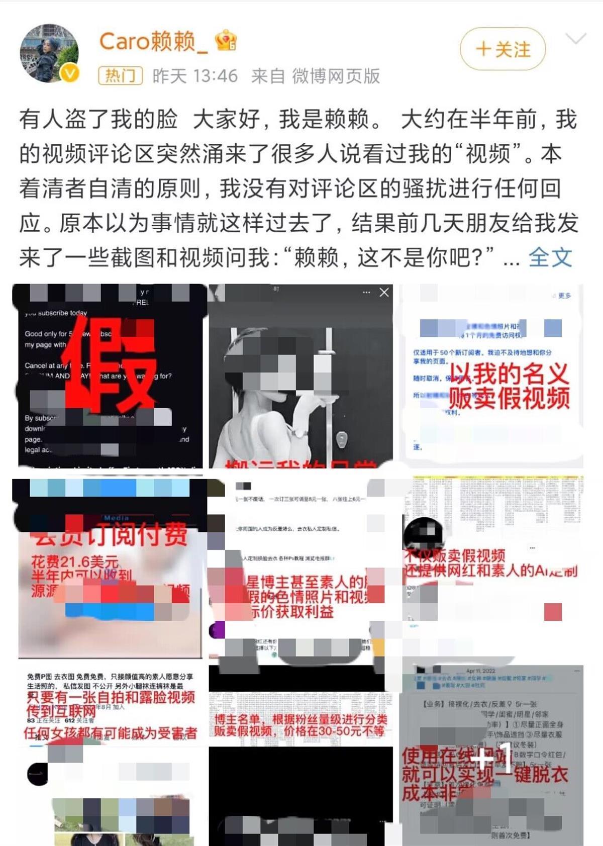 4月26日,在社交平台有着百万粉丝的网红博主“Caro赖赖_”发文称,有人盗了她的“脸”。据其介绍,大约在半年前,其视频评论区有多人说看过她的“视频”。本着清者自清的原则,她没进行任何回应。但前几天,其朋友给她发来一些了截图和视频。但当她看到视频里的女演员的脸和自己一模一样,“Caro赖赖_”称,这时她自己意识到“脸”可能被盗用了。