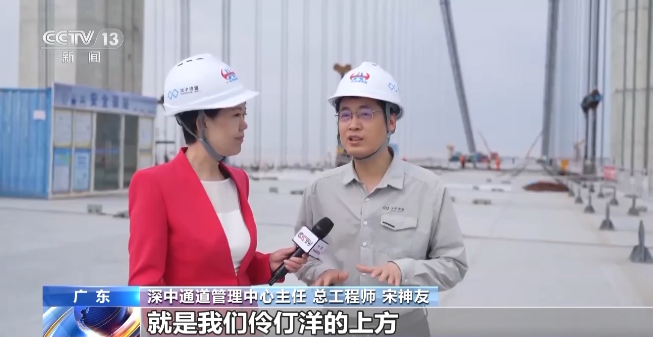 深中通道管理中心主任、总工程师 宋神友:我们目前所在的地方就是伶仃洋的上方,这里有三条最主要的航道,在深圳侧的上游有深圳宝安国际机场,所以我们整个项目既要满足航运未来发展的需求,又要满足航空限高的需求,从整个工程风险特别是营运风险更为可控,工程规模适度,桥隧组合方案比全隧方案更优。为了实现桥梁和隧道的快速交通转换,就在中滩设置了西人工岛。