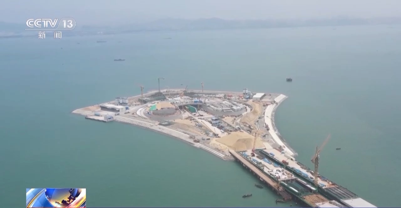 总台央视记者 李伟代:深中通道西人工岛是深中通道桥隧转换的关键构造;从这里开始,深中通道将从桥梁部分转入海底隧道部分,未来汽车将从这里驶入海底隧道。