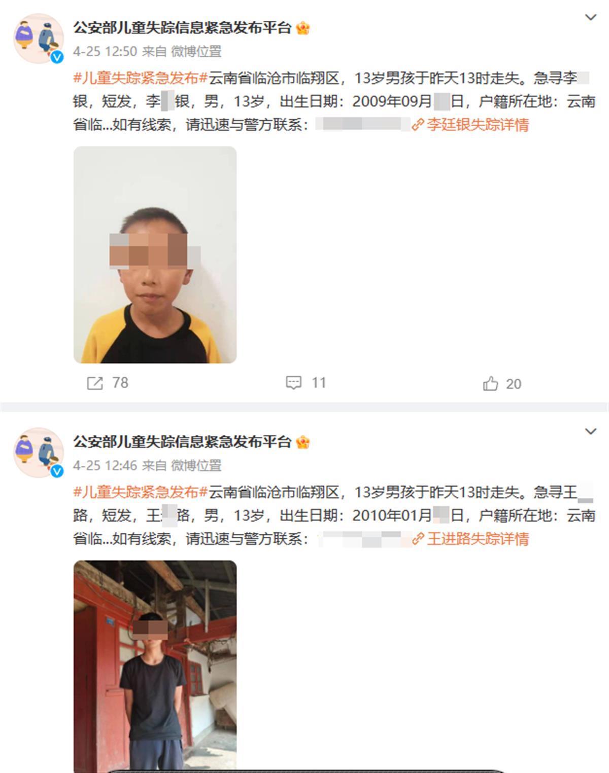 极目新闻此前报道,4月25日,有网友发布消息称,云南省临沧市临翔区凤翔街道办事处竹蓬村的13岁男孩李某银,与该街道新村村委会三组的13岁男孩王某路于4月24日走失,家长多方寻找未果。