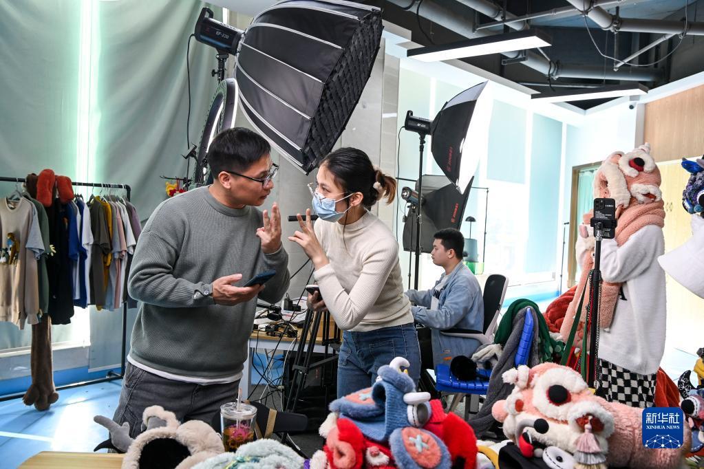 何继良(左)在广西桂林的工作室与直播销售团队的工作人员交流(1月10日摄)。