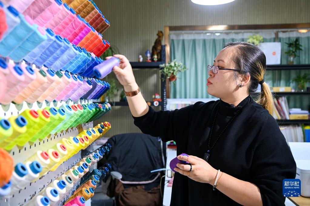 4月25日,刘思蔚在位于广西桂林的工作室内选择创作用的针线。