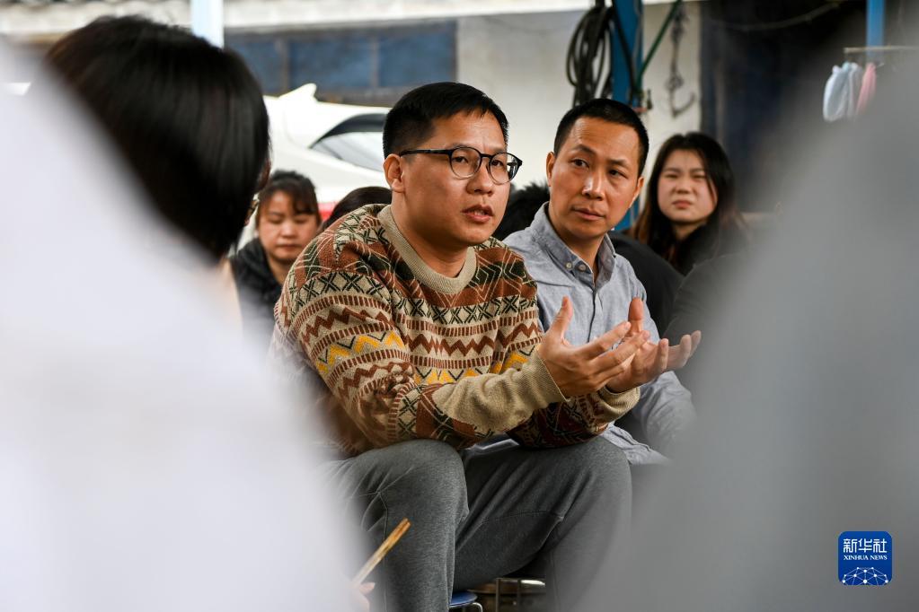何继良(右三)与团队的生产人员在广西桂林的一处生产车间交流(1月11日摄)。