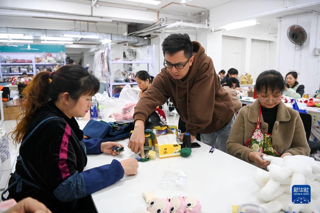 4月25日,刘思蔚(右)在位于广西桂林的一处生产车间指导工作人员缝制产品。