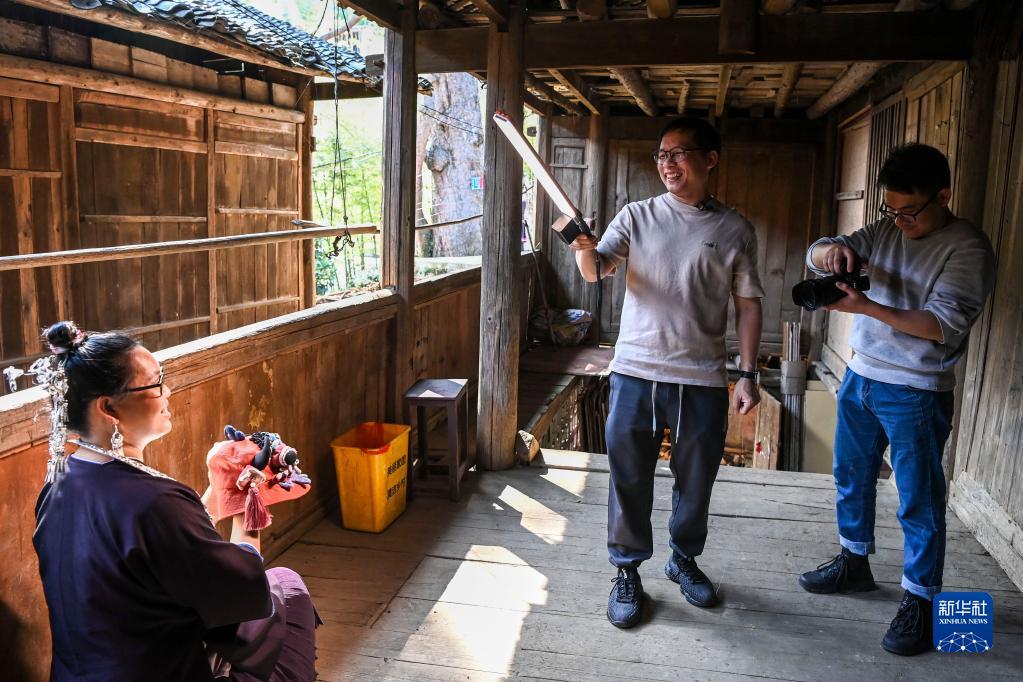4月26日,何继良(中)在广西桂林市龙胜各族自治县的一处民居带领拍摄团队为新产品的宣发进行创作。