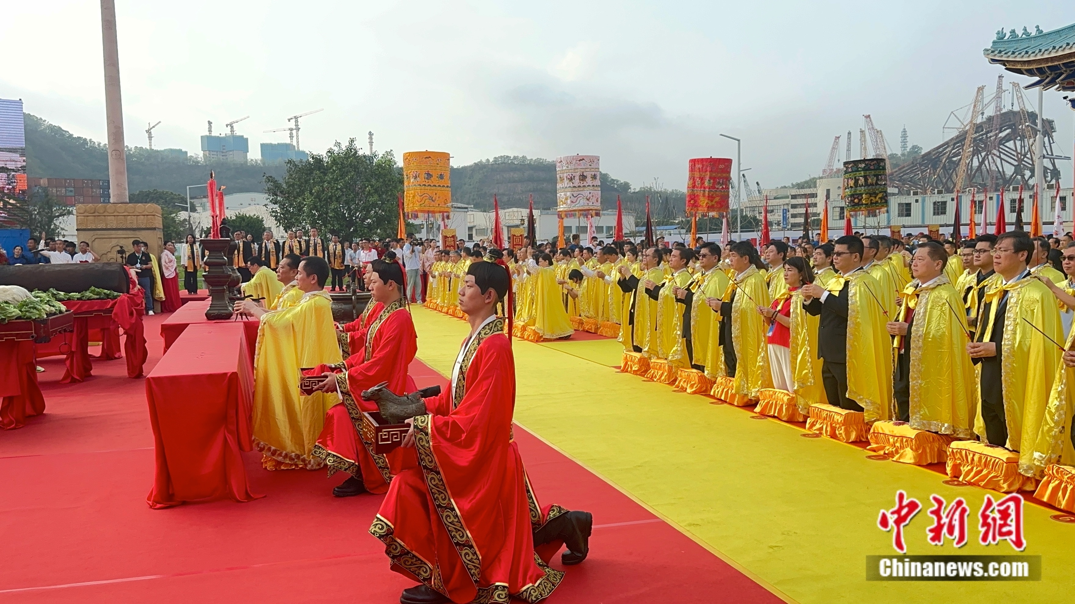 上午7点30分,正祭仪式正式开始。深圳南山天后博物馆遵循古制,恢复古礼,结合岭南传统文化,再现明代“辞沙”祭祀的场景。大典现场,祭祀嘉宾和承献官等在主持人的引导下,将祭祀流程一一完整演绎。