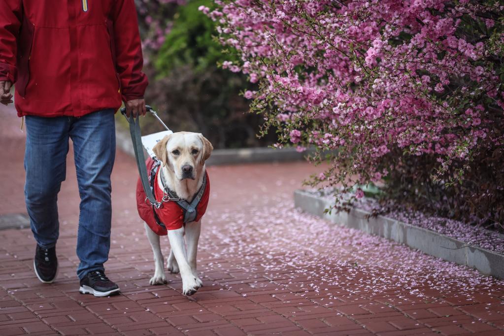 中国导盲犬大连培训基地的训导员付明岩对在训犬“沐沐”进行训练(2021年4月22日摄)。新华社记者 潘昱龙 摄