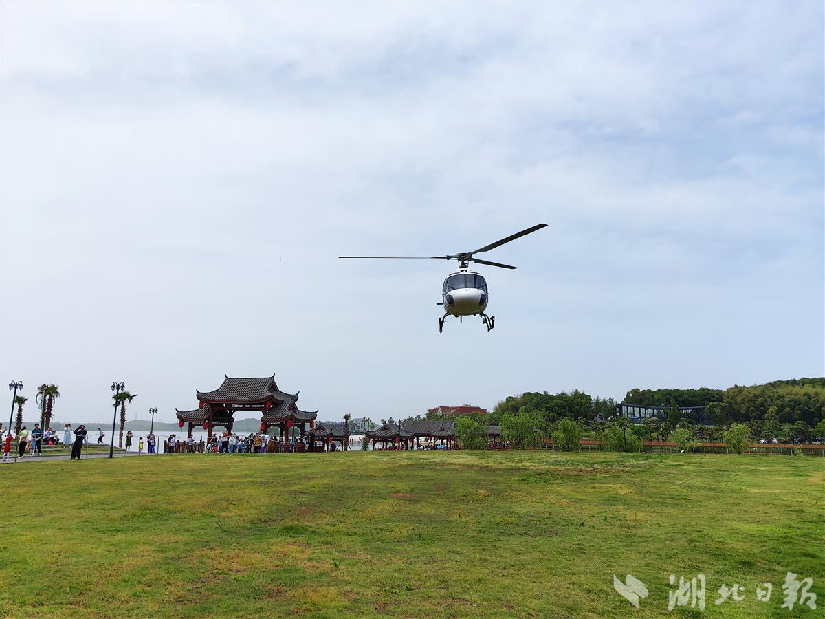 湖北日报讯(记者汪洋、王楚、通讯员熊熙)4月30日上午10时30分,嘉鱼县蜜泉湖旅游度假区临时停机坪,一架型号为“法国空客H125”的雨燕通航直升机载着游客腾空而起,沿观景线路低空飞行,空中俯瞰蜜泉湖、三湖连江、嘉鱼县城等美景。