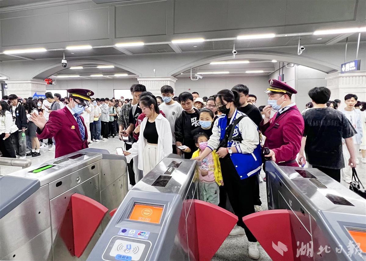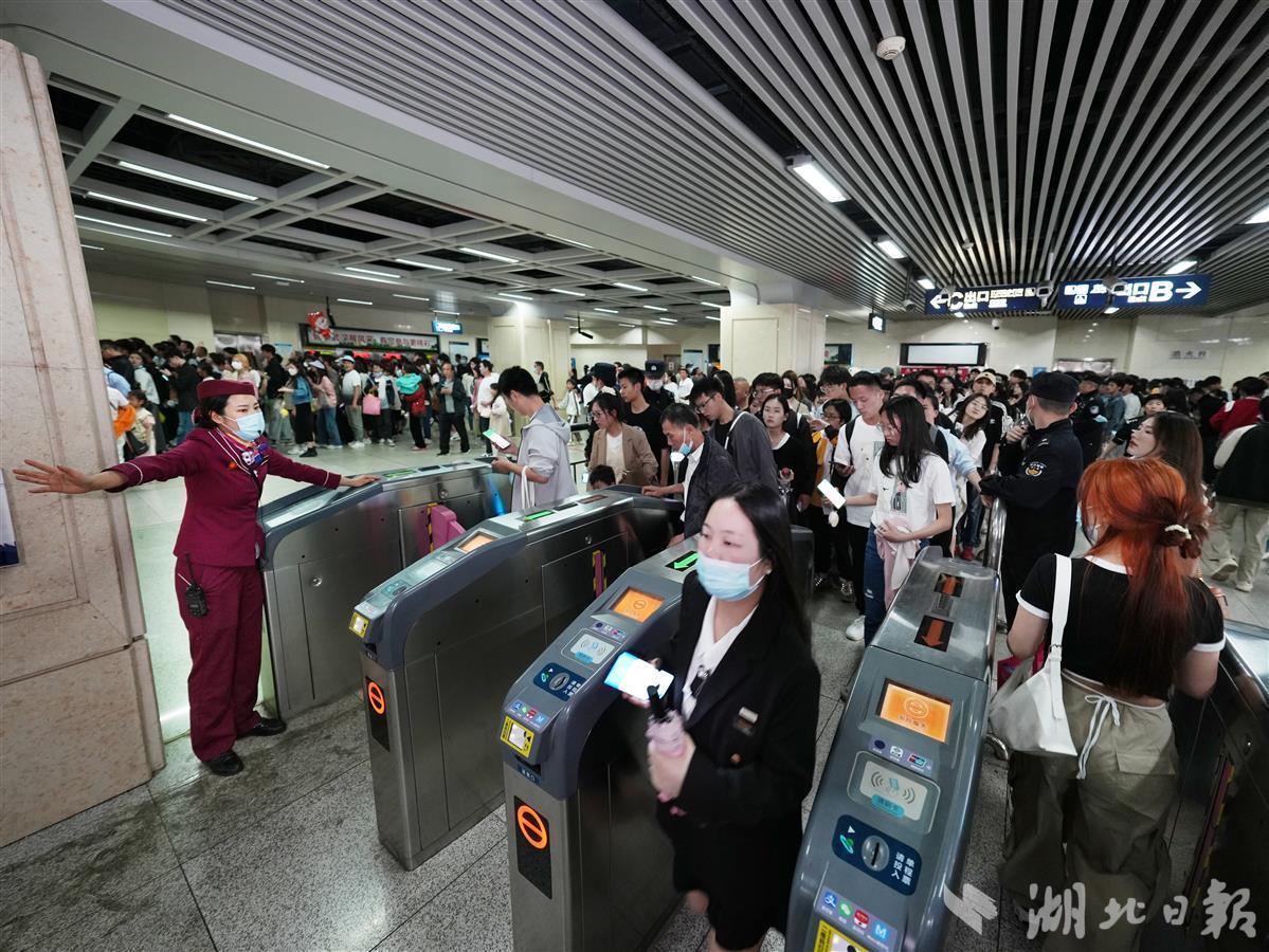 “调整一部下行电梯至上行”“B端4组出站闸机已调至进站”“新增进站通道所有人员已准备完毕”“A端4组出站闸机已调至进站”“上报中心准备增开临客”......4月30日21时许,武汉地铁2号线江汉路站进站客流突增,值班站长文冯婕的对讲机响个不停,行车值班员以及电梯、售检票专业人员调整相关设备,在原2台安检机4个通道的基础上,再新增2处无包快检进站通道。
