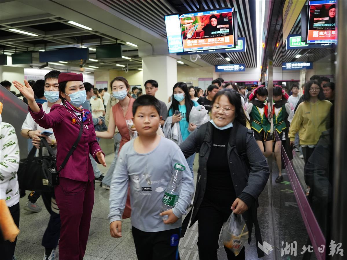 “客流最高峰与江汉路相似,也是在夜间,大多数是出站打卡夜景黄鹤楼的乘客。”司门口黄鹤楼站值班站长江源说,为引导乘客高效进出站,车站及时增设回形铁马、调整电梯方向、联动指挥调度中心加开临客并延长列车停站时间、设置进出站次序免检模式提高乘客进出站效率、全站人员高效配合疏导,多举措减少乘客等待时间,保障了最高峰时段万余人次的客流组织工作平稳、有序、高效。