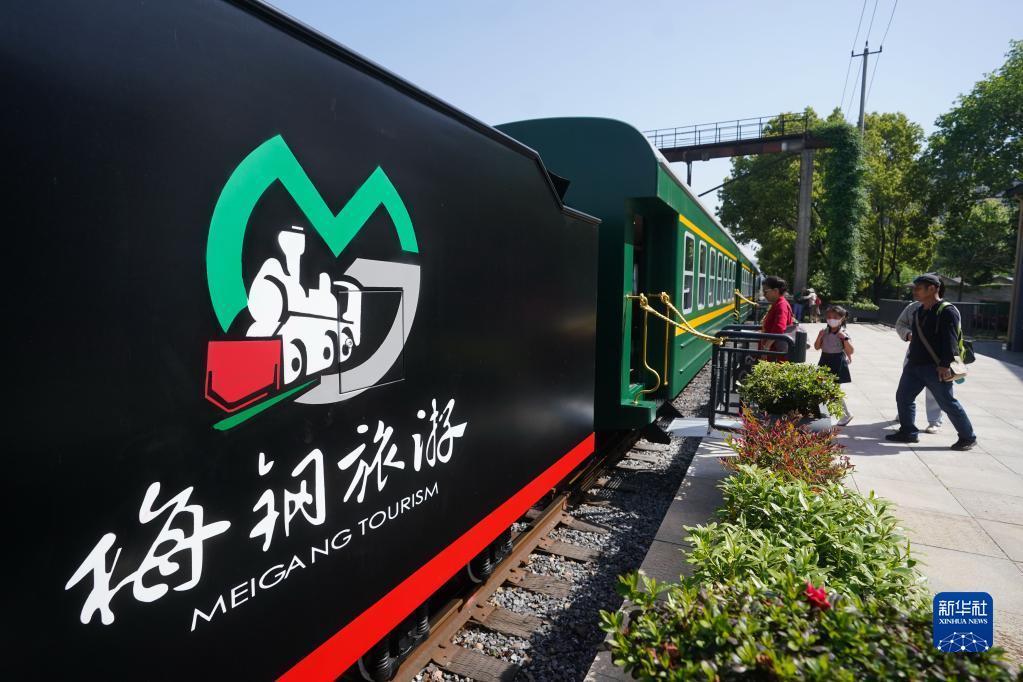 5月1日,游人乘坐“梅钢号”观光车。