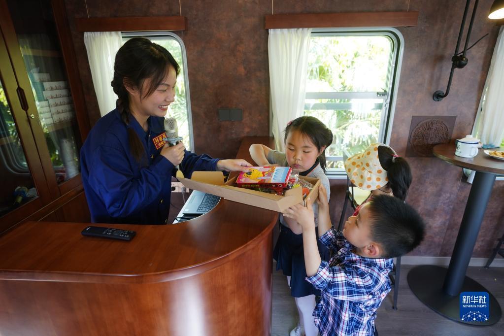 5月1日,在“梅钢号”观光车上,小朋友答题成功后领取奖品。