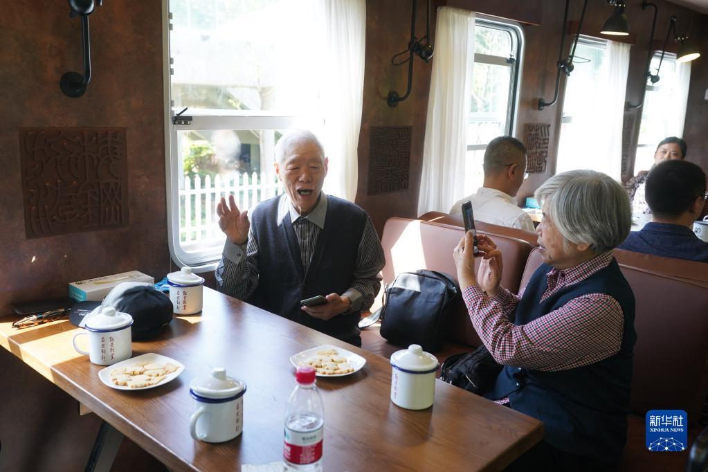 5月1日,游人在“梅钢号”观光车上唱怀旧歌曲。