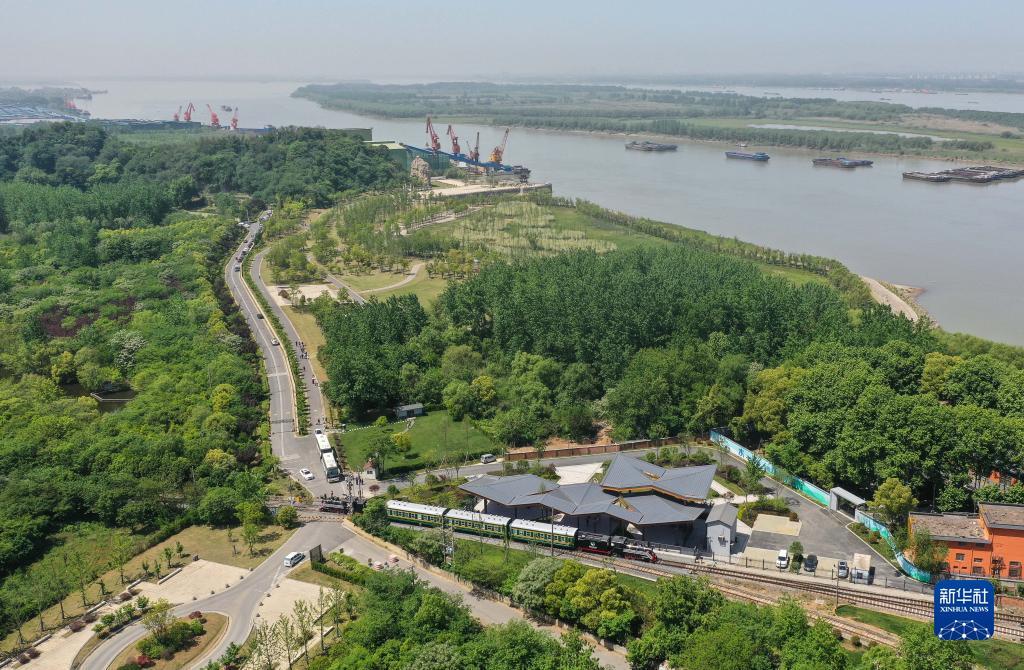 5月1日,“梅钢号”观光车行驶在南京市雨花台区三山矶生态公园(无人机照片)。