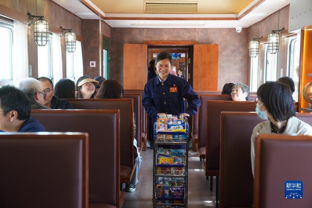 5月1日,工作人员在“梅钢号”观光车上售卖商品。