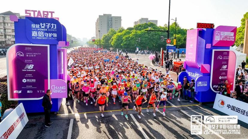 新华社上海5月1日电(记者许东远)1日,2023上海女子半程马拉松赛鸣枪起跑。4800名女性跑者欢聚于上海市长宁区,张草第一个冲过终点线。