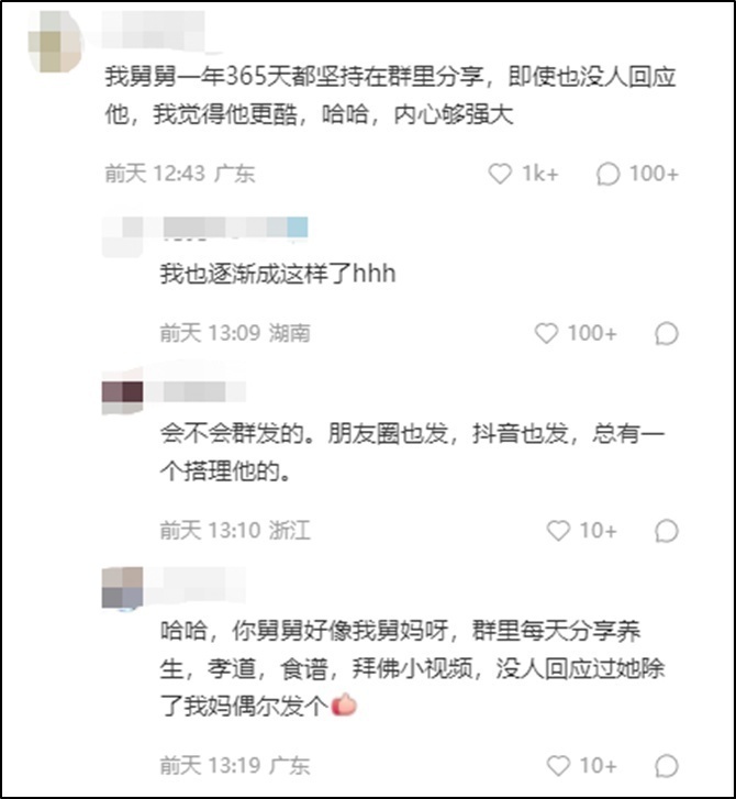 家人群不仅仅是一个互通有无的通讯工具,也不只是谁家有了事,在群里吆喝通知一声,除了信息功能,它还承载着情感功能。当下,很多家庭的物质生活已经很充裕了,父母的温饱并不是问题,但我们或许忽略了“精神养老”。