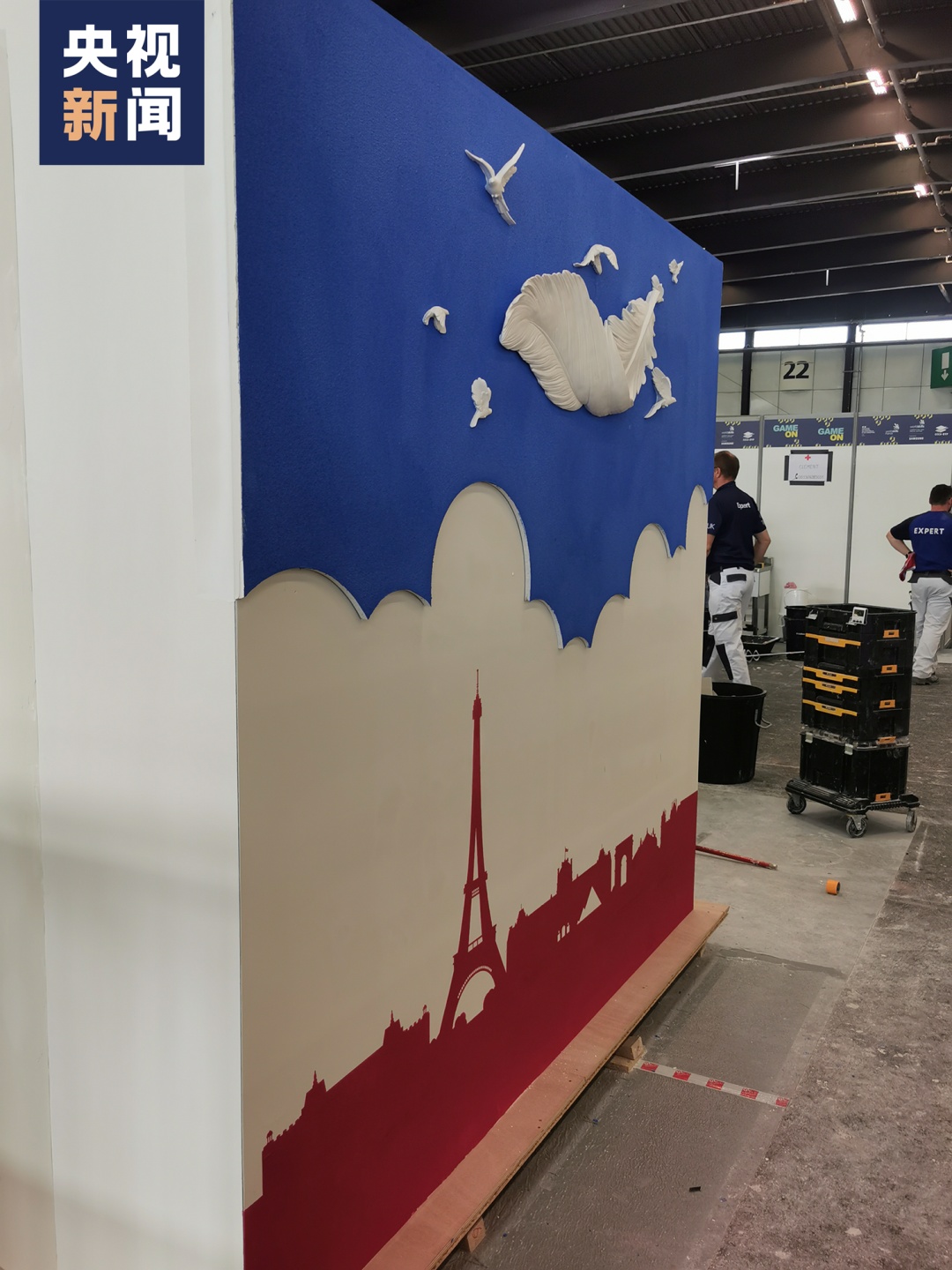他构思的是埃菲尔铁塔与蓝天交相辉映,顶部中央一枚卷起的白色羽毛被群鸽环绕。“羽毛和鸽群是最大的难点,它们是3D的,细微的地方需要镊子抠出细节。”