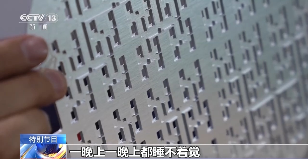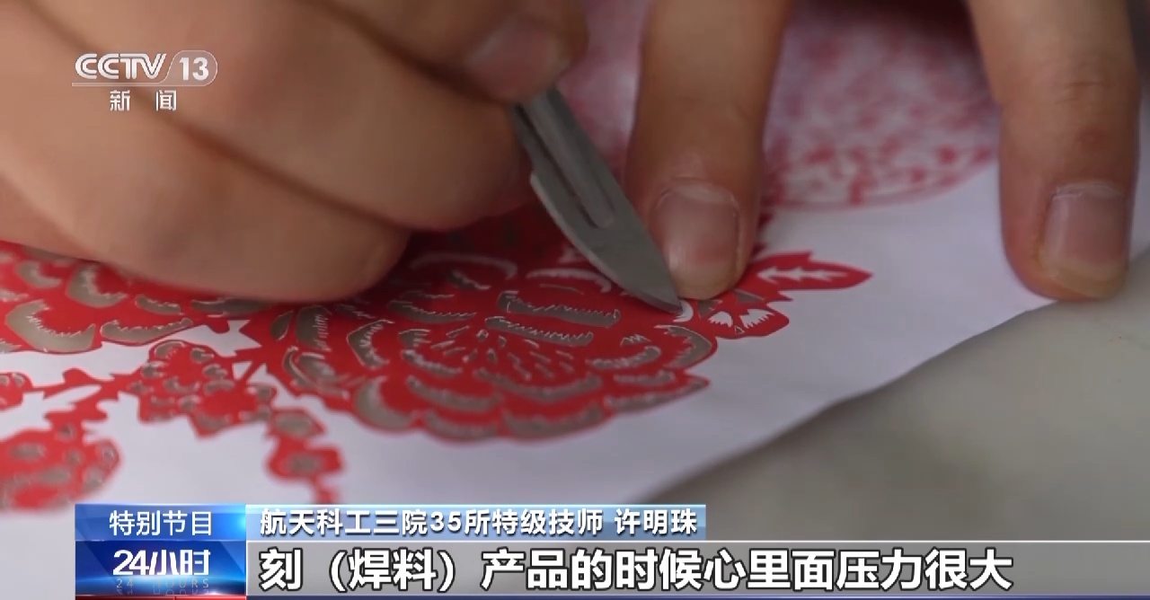 航天科工三院35所特级技师 许明珠:我零件上面有很多小凸台,窗花这上面有很多小尖点,在我运刀的时候,要手很快很稳。刻焊料产品的时候心里面压力很大,有时候,一个小的尖点没有注意到,它就整个导致我的零件报废。