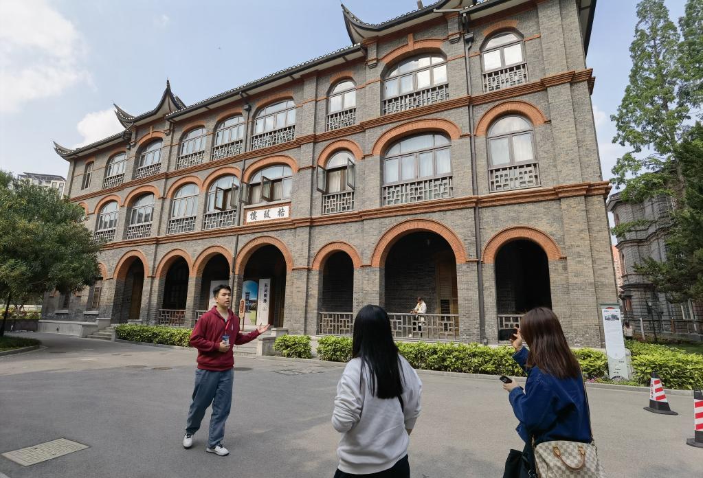 华东政法大学学生向游客讲解校园内的历史建筑。新华社记者 陈爱平 摄