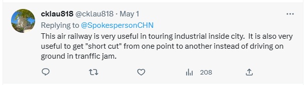 网友:这条“空中铁路”对旅游很有积极的意义,在交通堵塞的情况下,从一个地方到另一个地方走了“空中捷径”,而不是从地面上,这是很有效率的交通方式。