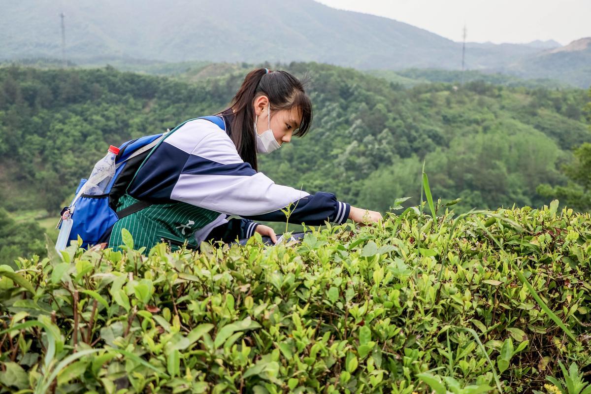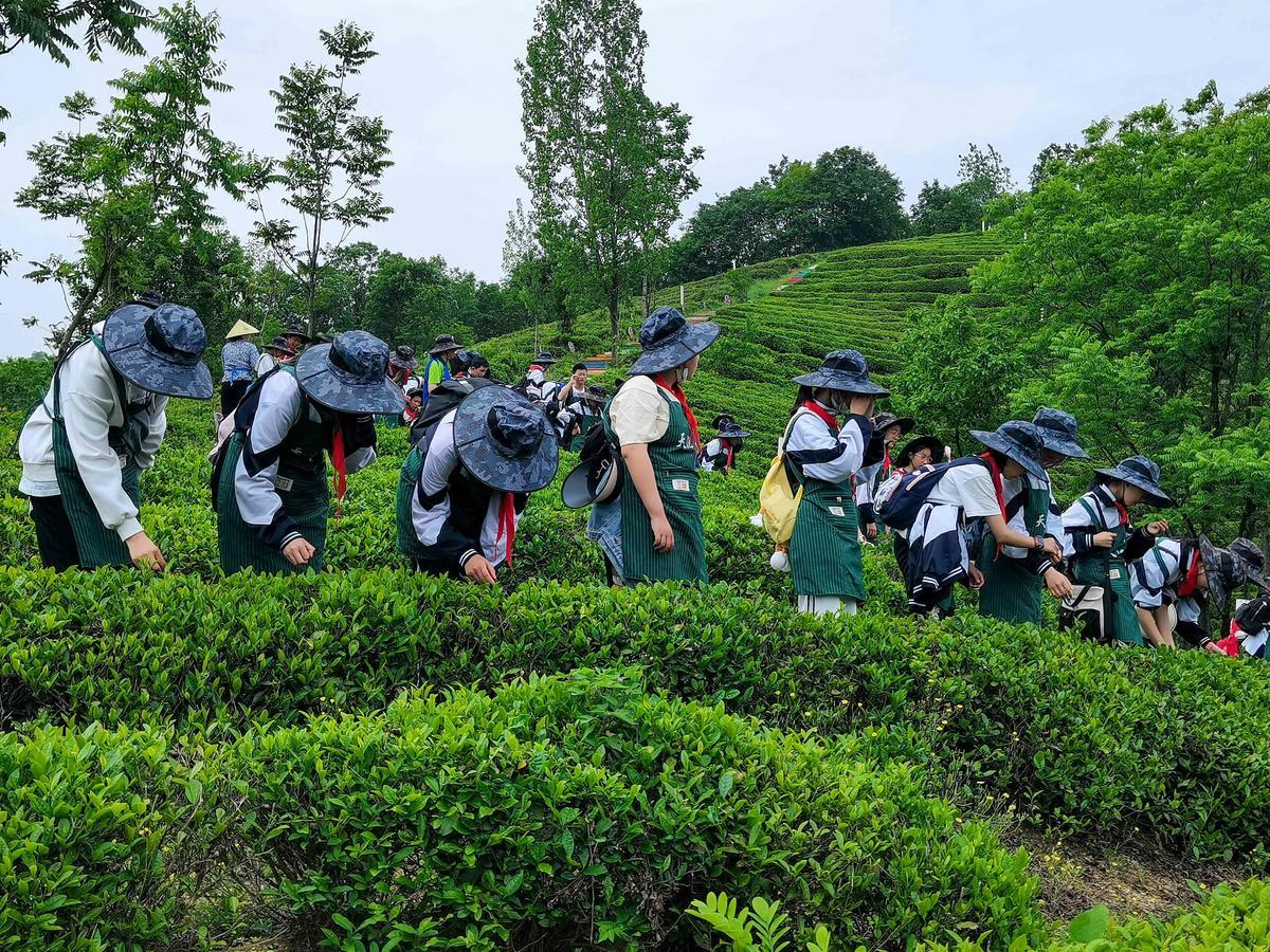 一芽一叶一抹香,一人一篓采茶忙。“小茶农”们徜徉于馨香氤氲的梯田茶树间,细细感受茶园的清新芬芳,在采摘中体会茶农的艰辛,体验劳动的快乐。