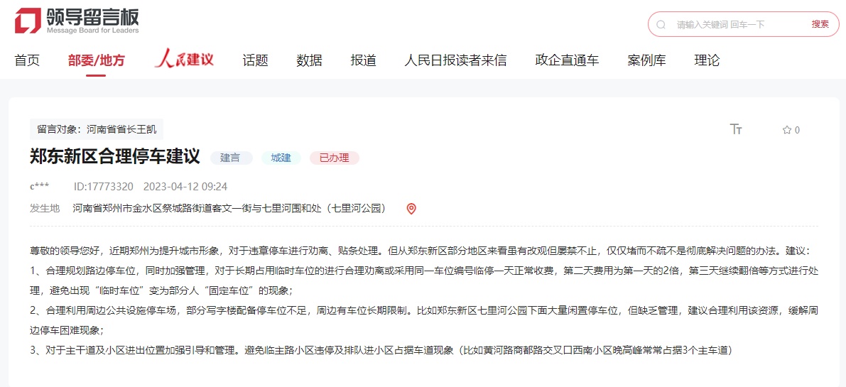 接到留言后,郑东新区管理委员会就该留言人所反映的停车难问题进行了核实,并将核实内容回复给该留言人。