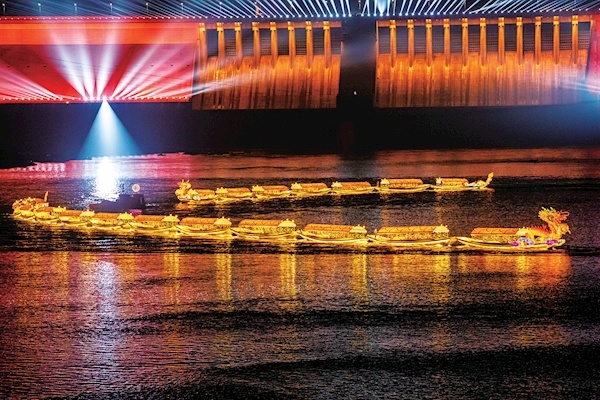 日前,笔者拍摄的丹江口大坝灯光秀表演现场。“五一”假期每晚19时30分至22时30分,丹江口市在大坝下游水域举行灯光秀表演,用1000套激光灯、4000多套灯柱以及金龙造型的彩船点亮大坝、扮靓汉江,吸引众多游客夜游丹江口,感受“水都花月夜”的独特魅力。通讯员牛夺战摄