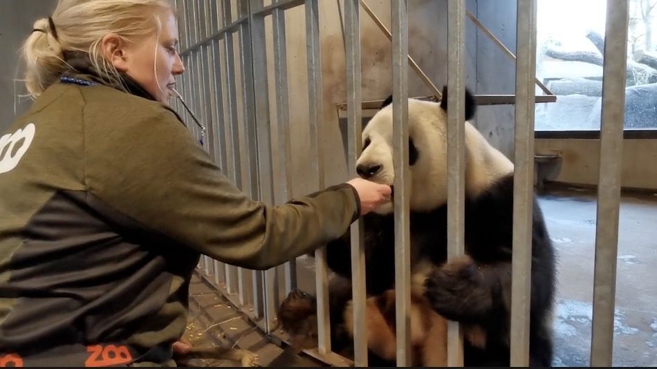 哥本哈根动物园饲养员喂大熊猫食物。视频截图