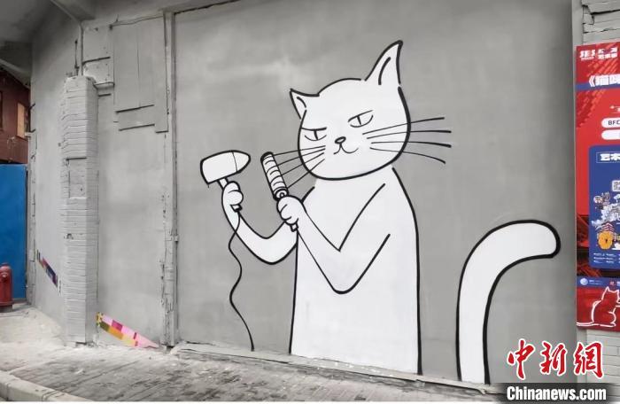 墙上漫画中,一只白猫正拿着吹风机吹着它的胡须。 郑莹莹 摄