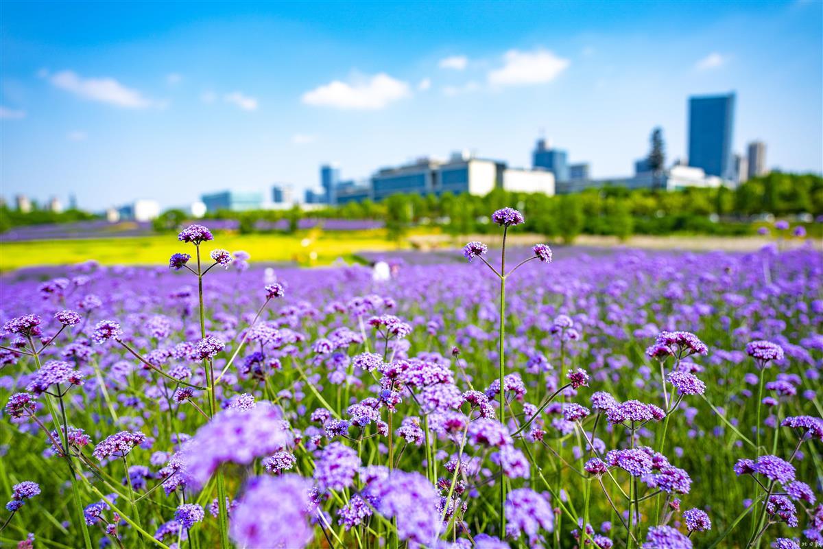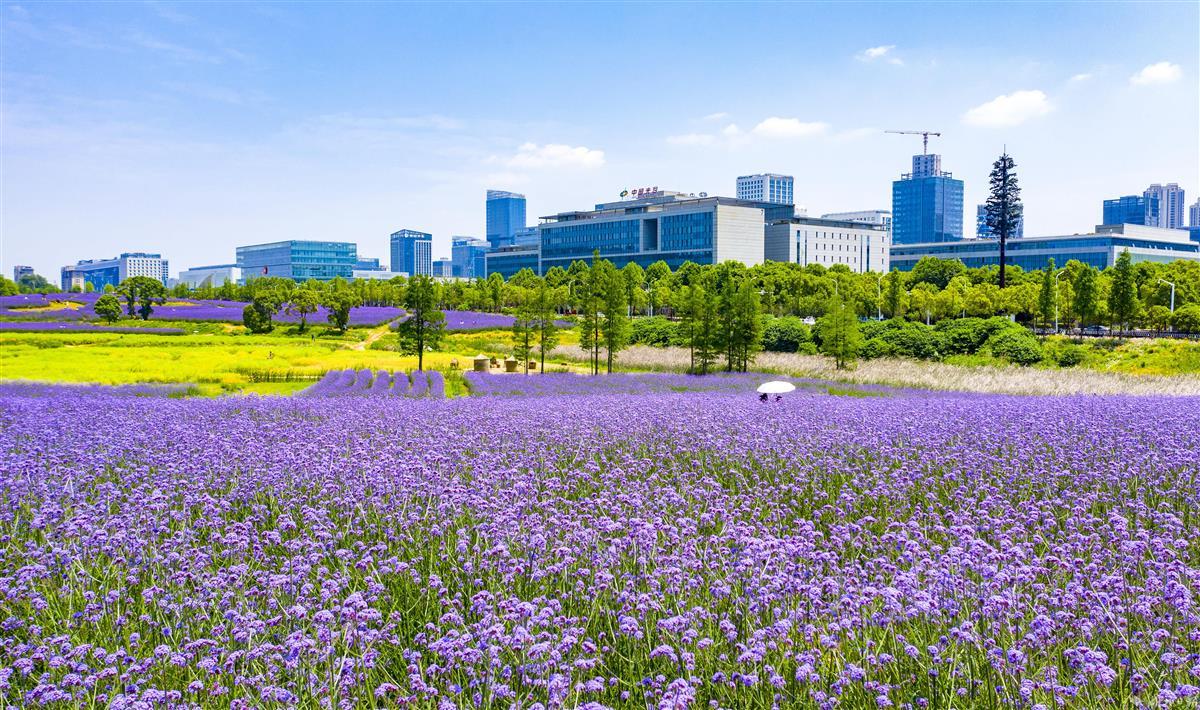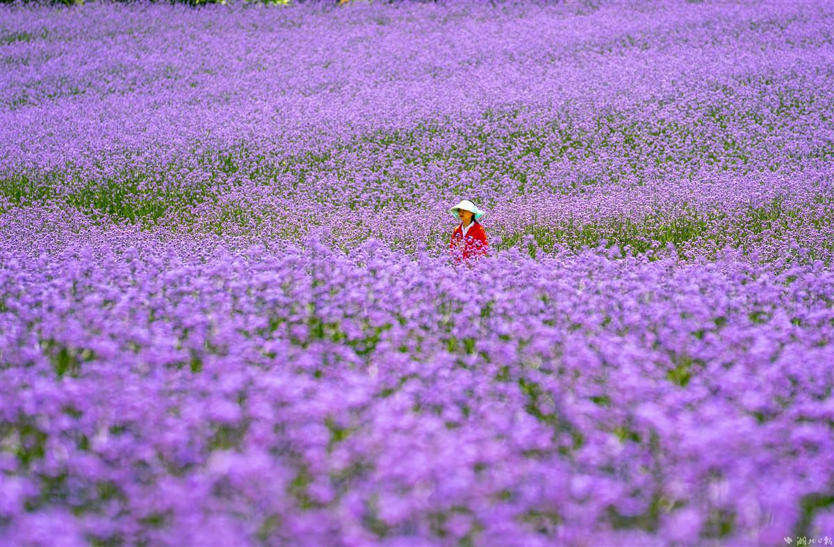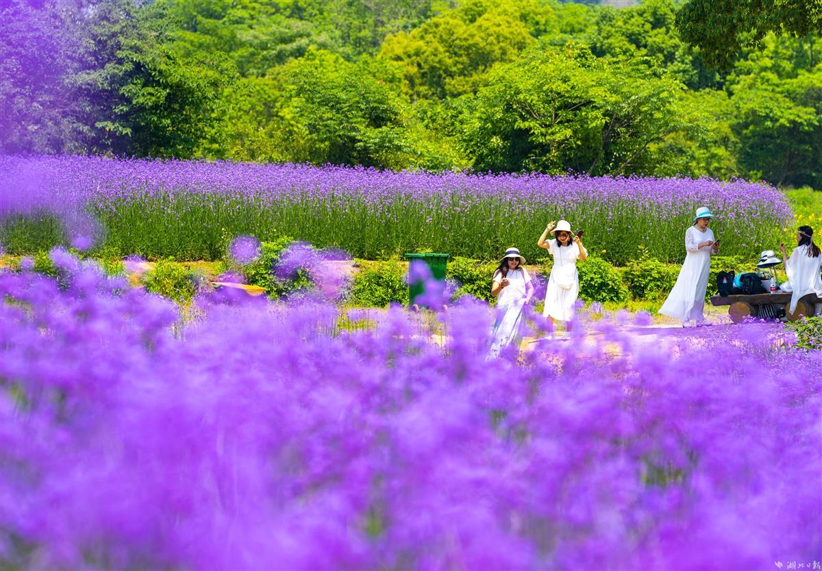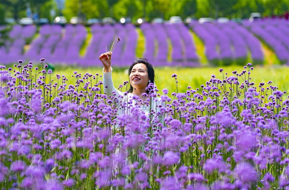 5月8日,武汉东湖高新区的“光谷网红花海”,柳叶马鞭草提前盛放,吸引不少市民前来拍照打卡。大片齐腰高的柳叶马鞭草花团锦簇,迎风摇曳,与即将丰收的油菜同框,相映成趣。据悉,首轮花期将持续至6月下旬,预计9月末进入第二轮盛花期。7月至10月,向日葵也将次第开放,形成花色互补的植物景观。