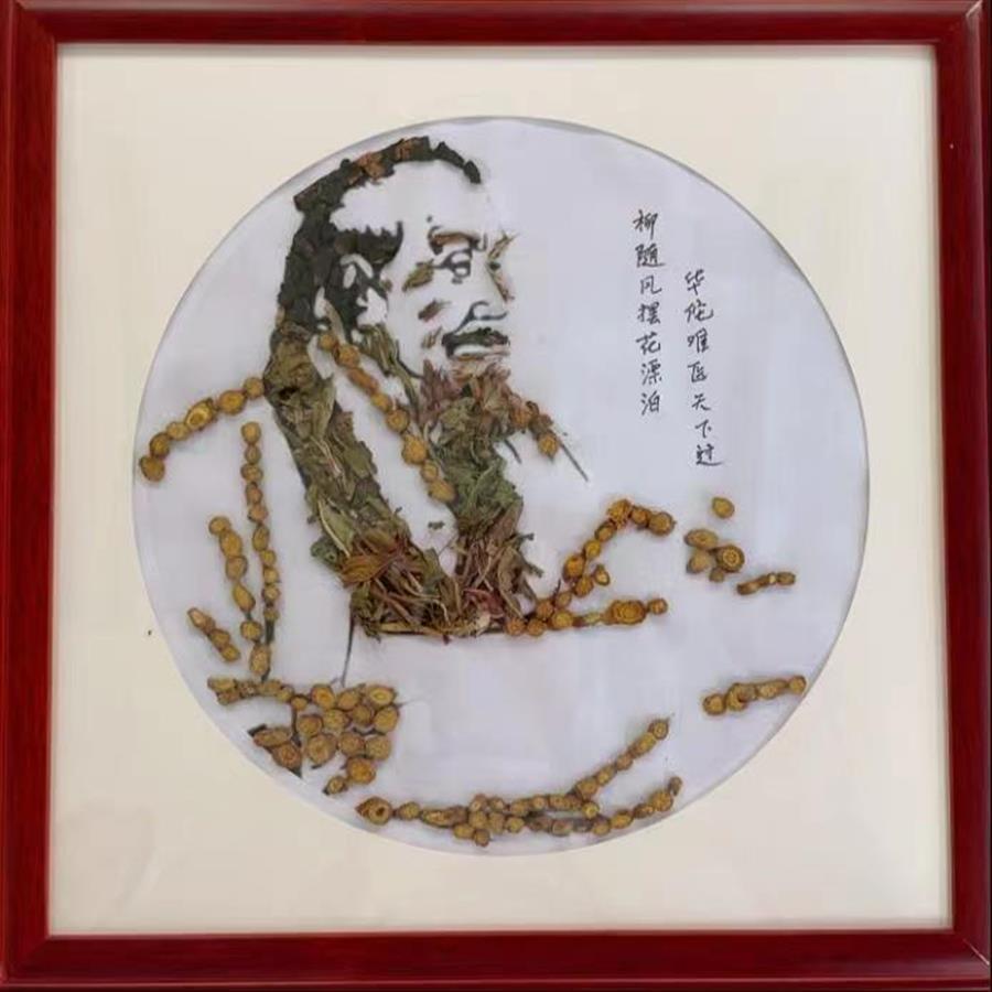 陈皮、川芎、红花等药材,在医患的巧妙搭配下,构成了画作《喜上眉梢》,寓意患者在精心护理下能够早日康复、喜上眉梢。当归、桔梗、防风、知母等药材,外形看似普通,但通过医患的智慧双手,拼绘成人物图神医《华佗》,惟妙惟肖。