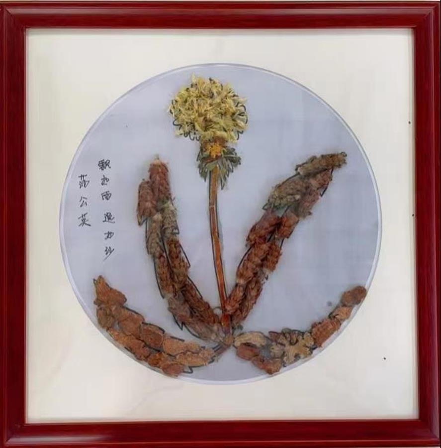 画作《蒲公英》中,医患使用夏枯草、菊花、北沙参等,拼绘蒲公英的花、叶、茎。“蒲公英是一种药食两用的植物,具有清热解毒,利尿散结功效,夏枯草可清泻肝火、化痰散结、平抑肝阳,菊花可疏散风寒、平抑肝阳、清肝明目……”一边创作画作的同时,中医科医护人员还一边向患者科普医学知识。