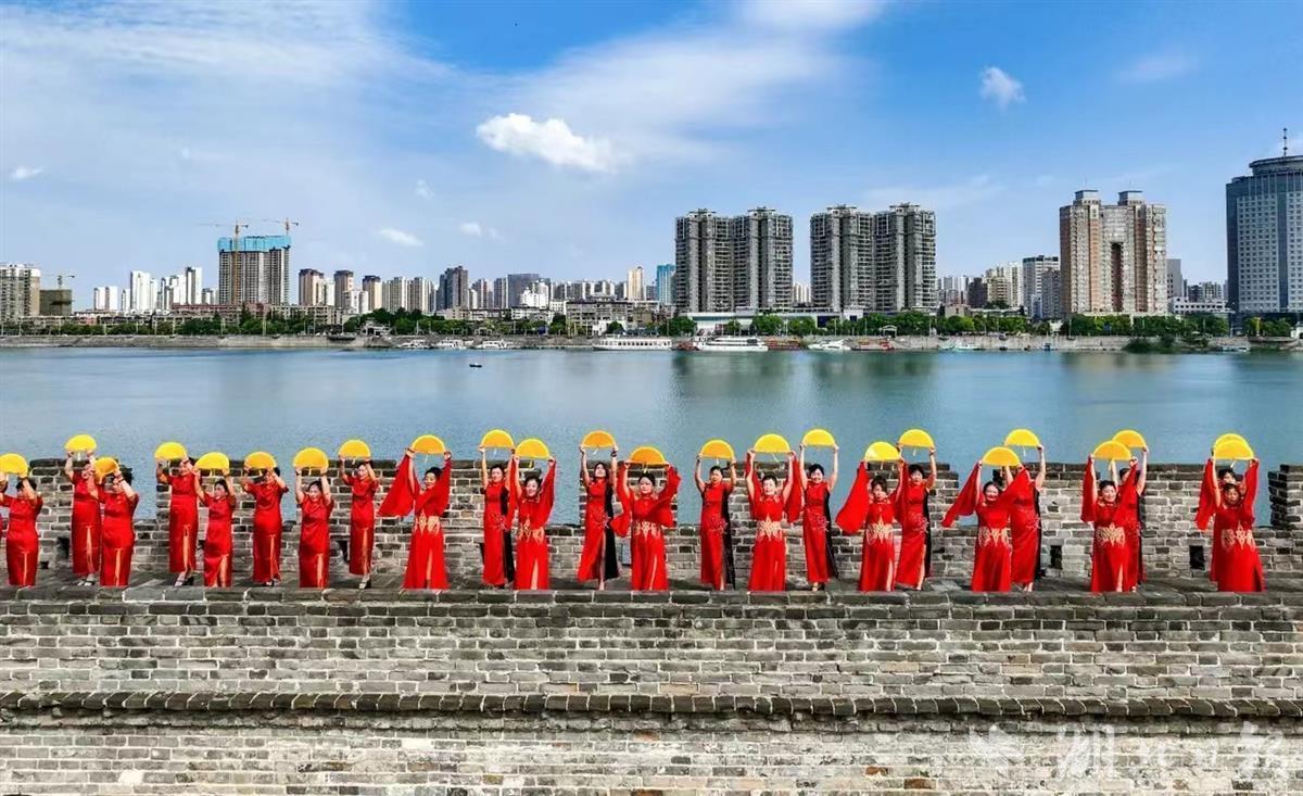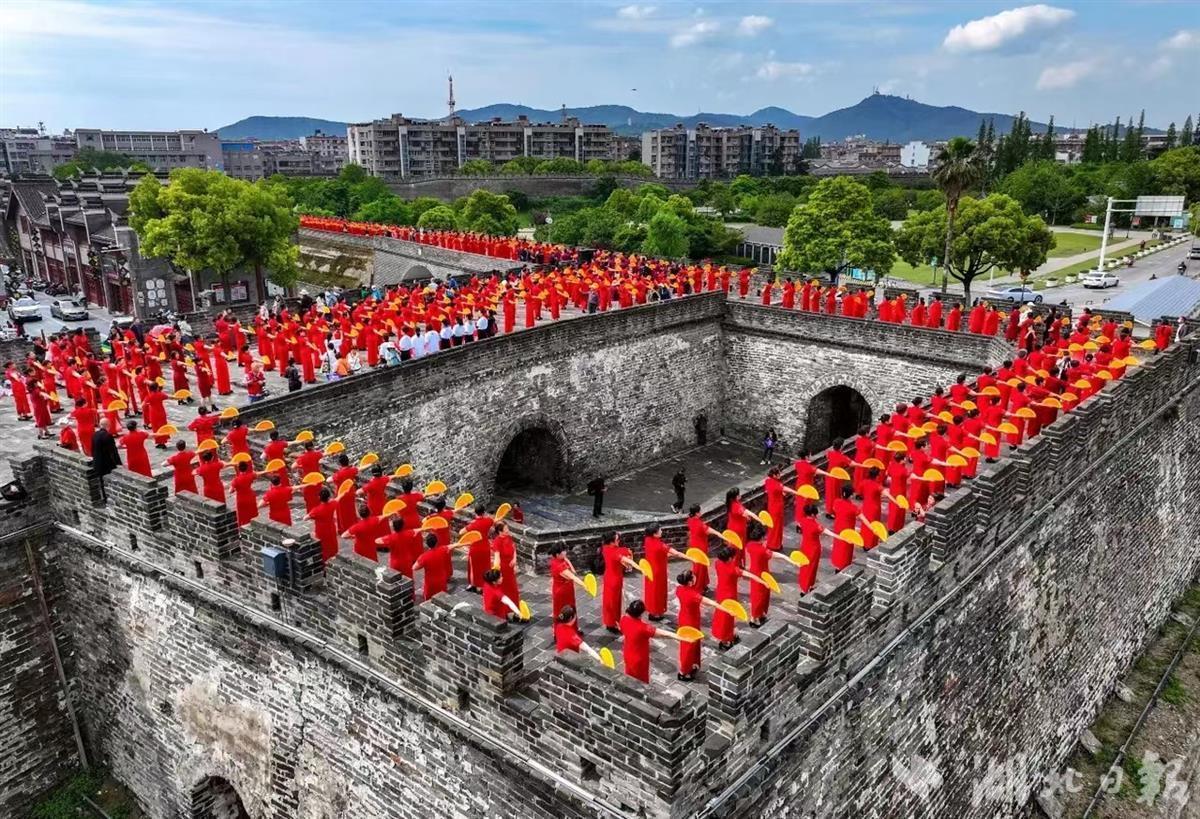 当天,襄阳市模特文化艺术协会带来“古城墙千人模特秀”,来自襄阳全市49支模特队的1361名走秀爱好者,身着红色旗袍,登上城墙,在《襄阳一路向阳》的歌声中上演精彩走秀,手持黄扇集体共舞。
