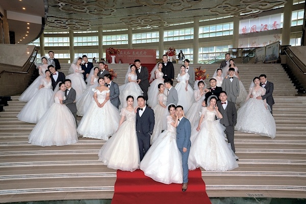 50对伴侣中有17对是新婚夫妻,有11对是结婚满10年的锡婚夫妻,有11对是结婚满20年的瓷婚夫妻,有11对是结婚满30年的珍珠婚夫妻。